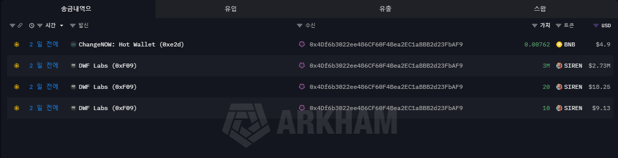 이틀전, DWF 랩스의 공개 지갑에서 현재 SIREN 토큰 시세($2.5) 기준 113억 원에 달하는 SIREN 물량이 이 지갑 주소로 이동했고, 아직 거래소로 입금되지는