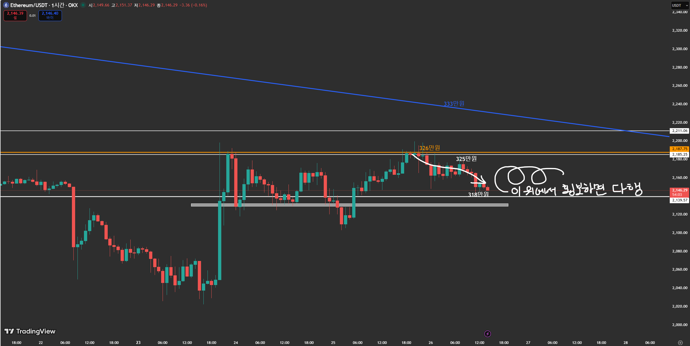 ↑이틀전 브리핑에서 이더리움 2,185~2,187달러 구간 '단기 저항대' 언급하며 이 구간 안착 여부가 추가 상승을 결정지을 것이라고 했는데,