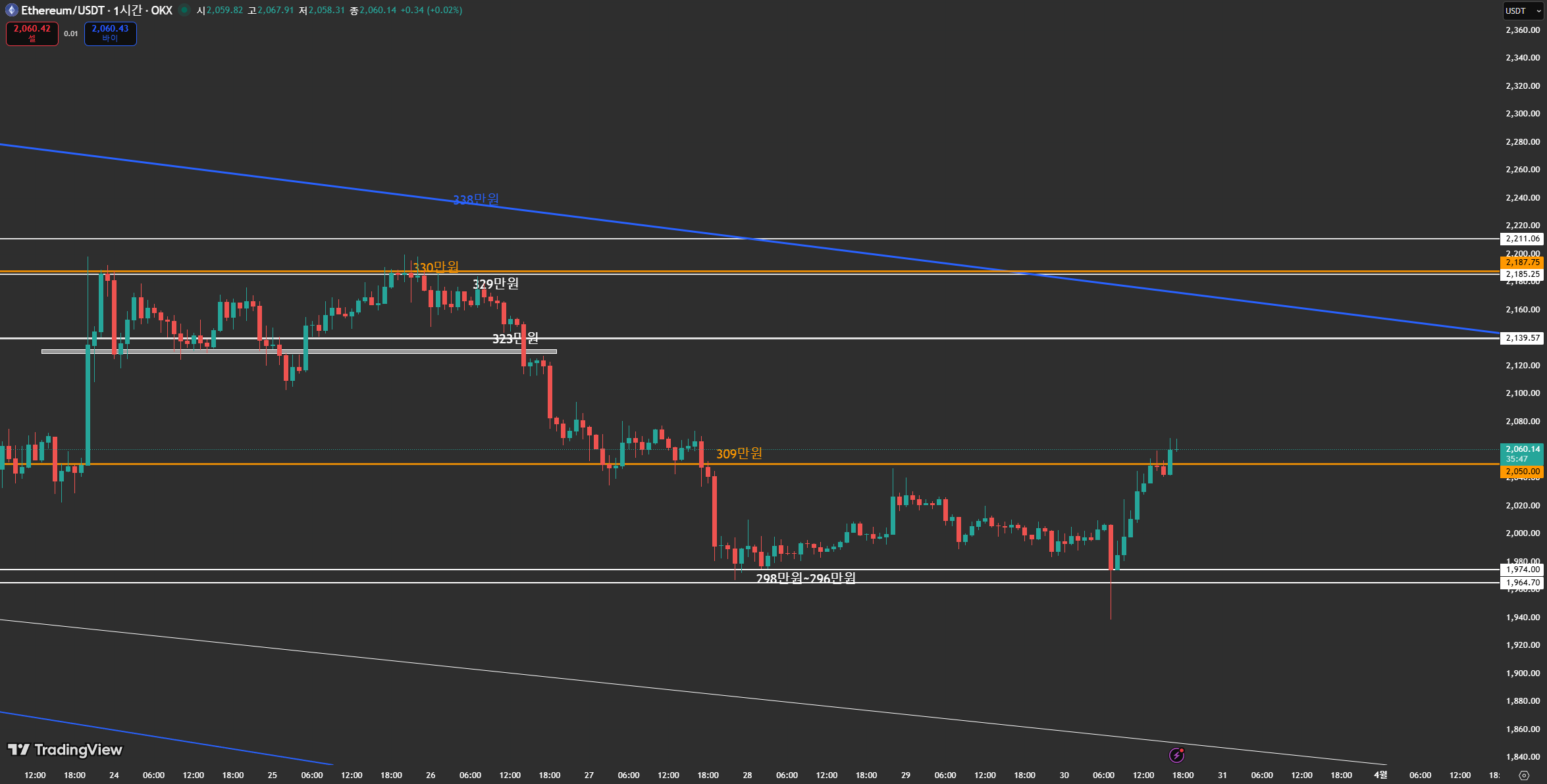 ↑금일 이더리움 60분 봉 차트입니다. 금일 오전 7시 1,938달러에서 긴 밑꼬리를 형성하며 반등세가 연출되었습니다.