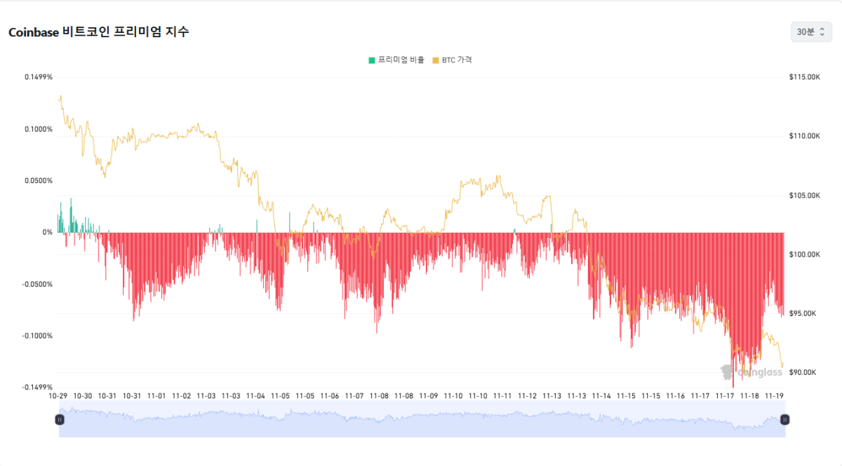 美 최대 암호화폐 거래소 코인베이스(Coinbase)의 비트코인 가격이 글로벌 평균 대비 낮은 수준을 유지하며 미국 시장의 투자 심리 변화에 대한 우려가 제기되고 있다.금일 암호화폐 데이터 분석 플랫폼 코인글래스(Coinglass)에 따르면, 코인베이스 비트코인 프리미엄 지수는 지난 달 말일 이후 현재까지 약 3주간 지속적으로 마이너스(-)를 기록 중이다. 19일 현재 동 지수는 -0.0499%를 나타내고 있다.