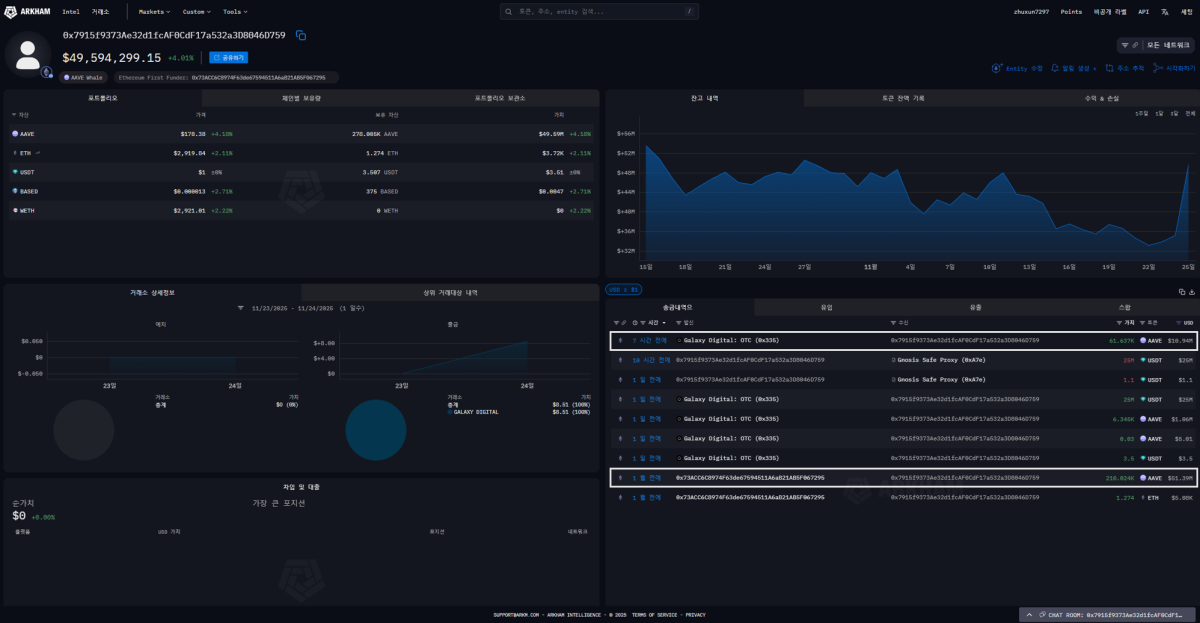 美 가상자산 전문 투자사 멀티코인 캐피탈(Multicoin Capital)이 금일 오전 4시경 에이브(AAVE) 토큰 6만 1,637개를 추가 매수하며 대규모 투자를 감행했다. 상당한 평가손실에도 불구하고 지속적인 매수세를 보이며 시장의 주목을 받고 있다.블록체인 데이터 인텔리전스 플랫폼 아캄(Arkham)에 따르면, 멀티코인 캐피탈은 이날 갤럭시 디지털(Galaxy Digital) 장외거래(OTC)를 통해 에이브(AAVE) 토큰 6만 1,637개를 매수했다. 거래 금액은 1,094만 달러(한화 161억 원)이며, 평균 매수가는 개당 177달러로 집계됐다.
