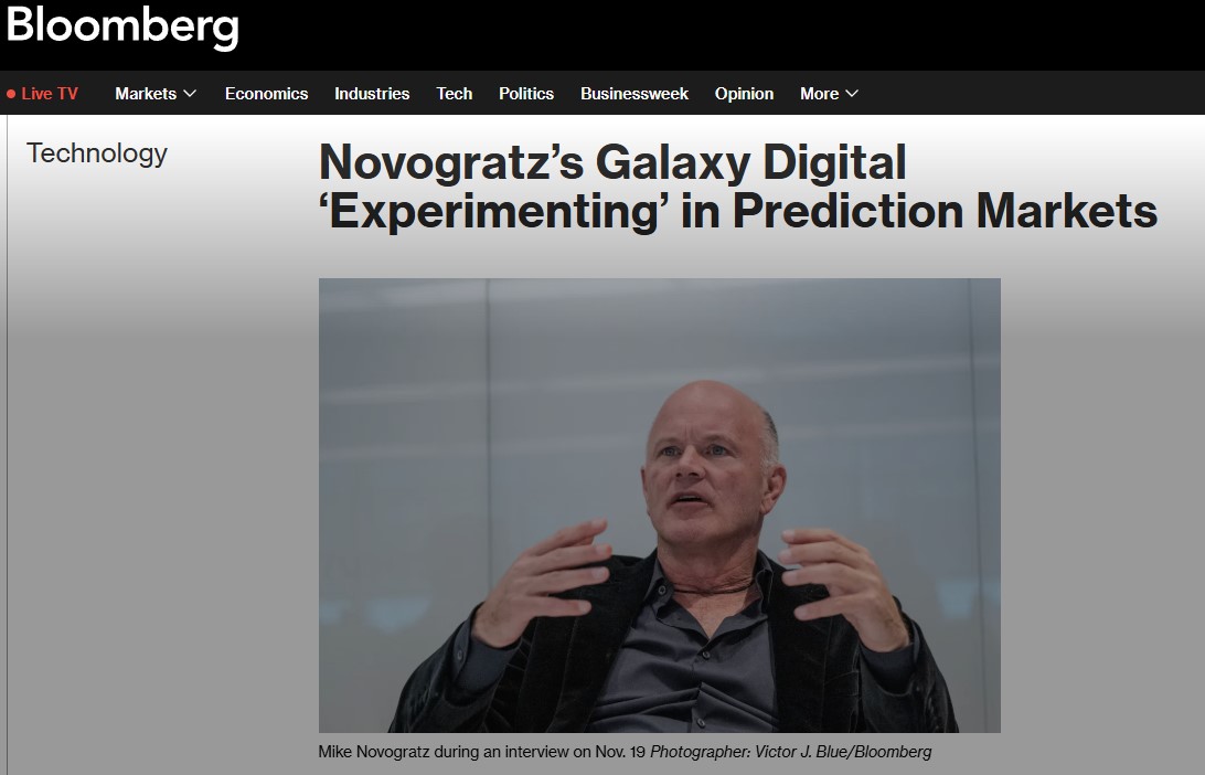 갤럭시 디지털 창업자 마이크 노보그라츠(Mike Novogratz)는 지난 19일 블룸버그 통신과의 인터뷰에서 "우리는 예측시장의 마켓메이킹 사업을 소규모로 시험하고 있다"며 "궁극적으로는 더 광범위한 유동성을 제공하게 될 것"이라고 밝혔다.