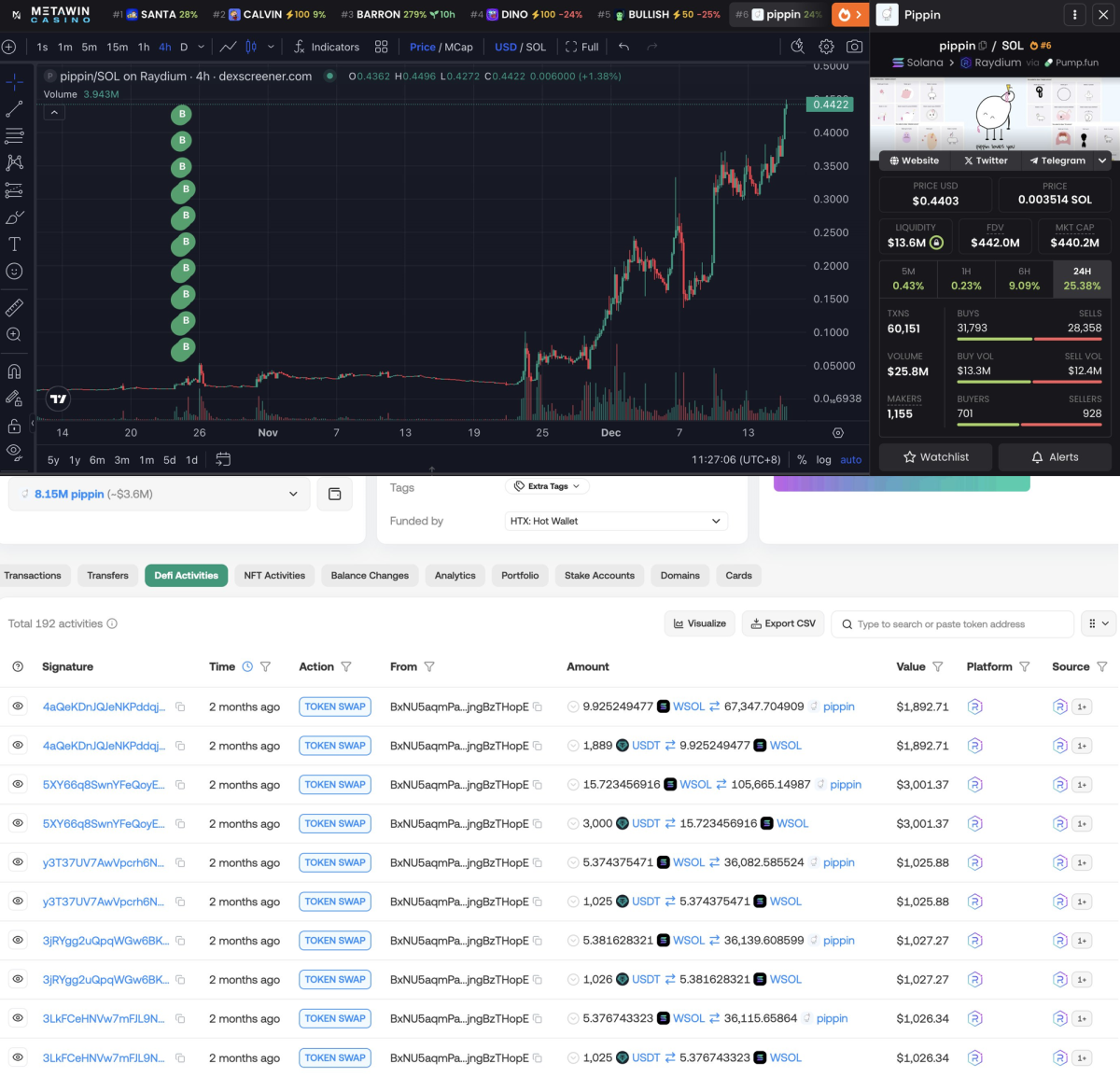 블록체인 분석 플랫폼 룩온체인(Lookonchain)이 금일 공개한 데이터에 따르면, 지갑 주소 'BxNU5a'로 식별되는 트레이더가 피핀(PIPPIN) 토큰 거래를 통해 18만 달러(한화 2억 6,550만 원)를 360만 달러(한화 53억 원)로 증식했다.룩온체인의 모니터링 결과, 해당 트레이더는 지난 10월 24일 18만 달러를 투자해 816만 개의 피핀(PIPPIN) 토큰을 매수했다. 이후 현재까지 보유 중이며, 해당 포지션의 현재 가치는 360만 달러로 집계됐다. 투자 원금 대비 20배의 수익률을 기록했으며, 투자 기간은 약 53일이다.