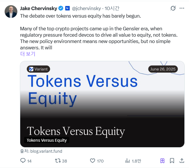 암호화폐 벤처캐피탈 베리언트 펀드(Variant Fund)의 제이크 체르빈스키(Jake Chervinsky) 최고법무책임자(CLO)가 전일 소셜미디어를 통해 "토큰과 지분의 역할 분담에 대한 논쟁이 이제 막 시작됐다"며 업계의 가치 구조 재편을 전망했다.체르빈스키는 "많은 암호화폐 프로젝트들이 게리 겐슬러 前 미국 증권거래위원회(SEC) 위원장 시대에 탄생했다"며 "당시 강력한 규제 압박으로 인해 개발사들은 거의 모든 가치를 토큰이 아닌 지분으로 귀속시킬 수밖에 없었다"고 설명했다.