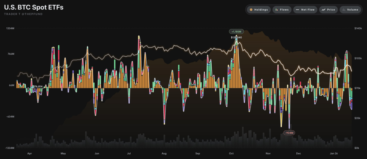 미국 현물 비트코인과 이더리움 상장지수펀드(ETF)에서 1월 20일 하루 동안 총 7억 달러(한화 9,870억 원) 이상의 자금이 빠져나가며 투자자들의 리스크 회피 심리가 뚜렷하게 나타났다.비트코인 ETF, 4.8억 달러 순유출…그레이스케일·피델리티 주도