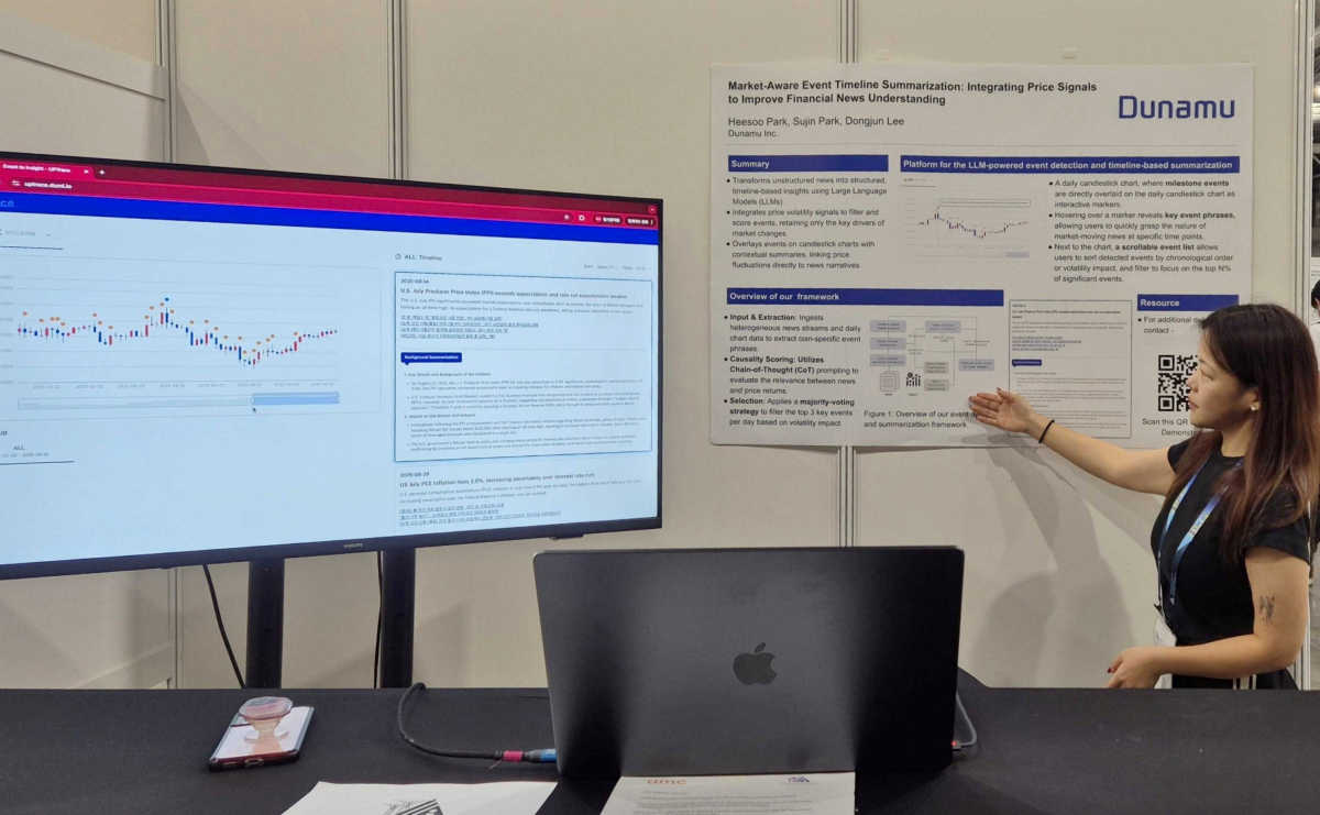 박희수 두나무 머신러닝팀 연구원은 AAAI 데모트랙에서 '시장 반응형 이벤트 타임라인 요약: 가격 신호 통합을 통한 금융 뉴스 이해도 향상(원문: Market-Aware Event Timeline Summarization: Integrating Price Signals to Improve Financial News Understanding)' 논문을 발표하고, 두나무가 자체 개발한 시스템을 직접 시연했다.