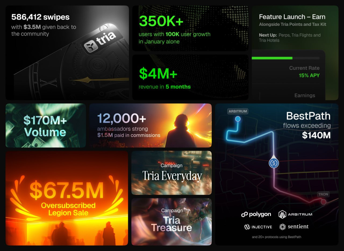'성장의 결실을 유저와 공유한다'는 원칙 아래 트리아는 58만 회 이상의 스와이프를 통해 총 350만 달러(한화 500억 8,500만 원)를 사용자에게 환원했으며, 앰배서더들에게는 150만 달러(한화 214억 6,500만 원)의 커미션을 지급하며 충성도 높은 커뮤니티를 형성했다.