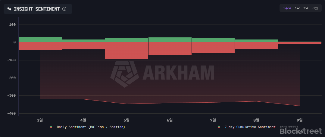 특히 지난 5일과 금일에는 약세 인사이트가 급증하며 누적 센티먼트 지표를 더욱 끌어내렸다. 5일에는 약 -200에 가까운 일일 약세 인사이트가 기록됐으며, 금일도 상당한 규모의 부정적 심리가 집계됐다.