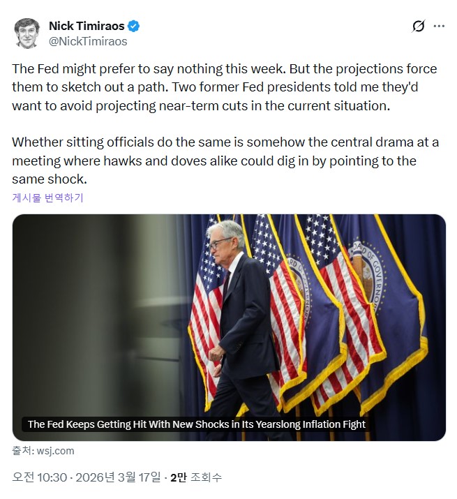 '연준 대변인(Fed Whisperer)'으로 불리는 월스트리트저널(WSJ)의 닉 티미라오스(Nick Timiraos) 기자가 17일(현지시간) 이번주 연방준비제도(Fed·연준) 회의를 앞두고 연준의 통화정책 방향을 전망하는 기사를 발표했다.티미라오스 기자는 연준이 이번주 침묵을 유지하길 원할 수 있지만, 경제 전망 발표 일정이 불가피하게 향후 통화정책 경로를 제시하도록 강제한다고 분석했다.
