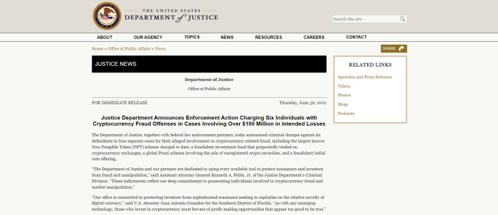 법무부는 "발러에이프 NFT 컬렉션 개발자는 투자자로부터 2백만 달러 이상을 조달하고 지난해 잠적했다"라며 "새로운 금융사기와 자금세탁 혐의로 유죄 판결을 받을 경우 최대 40년의 징역형에 처할 수 있다"라고 밝혔다.