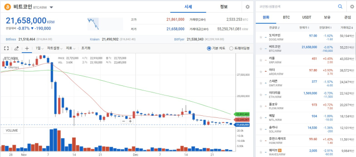 ◇비트코인 = 26일 오후 5시 업비트 기준 비트코인(BTC)의 가격은 2166만원을 기록했다. 비트코인 점유율(도미넌스)은 42.08%를 보였다.