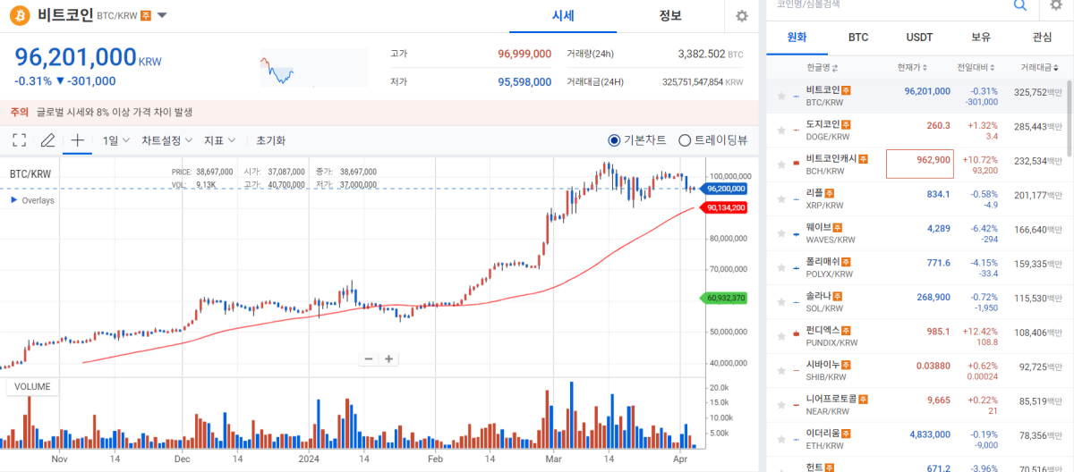 ◇비트코인 = 4일 오후 5시 업비트 기준 비트코인 가격은 9620만원이다. 비트코인 점유율(도미넌스)은 53.84%를 나타냈다.