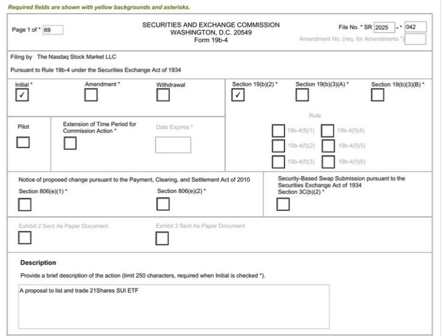 나스닥이 28일 미국 증권거래위원회(SEC)에 수이(SUI) 현물 상장지수펀드(ETF) 심사요청서 '19b-4'를 제출했다.나스닥이 상장을 요청한 수이 현물 ETF는 지난달 21 쉐어즈가 신청한 수이 현물 ETF다. 지난달 30일, 자산운용사 21 쉐어즈는 수이 현물 ETF 증권신고서 'S-1'를 SEC에 제출했다.