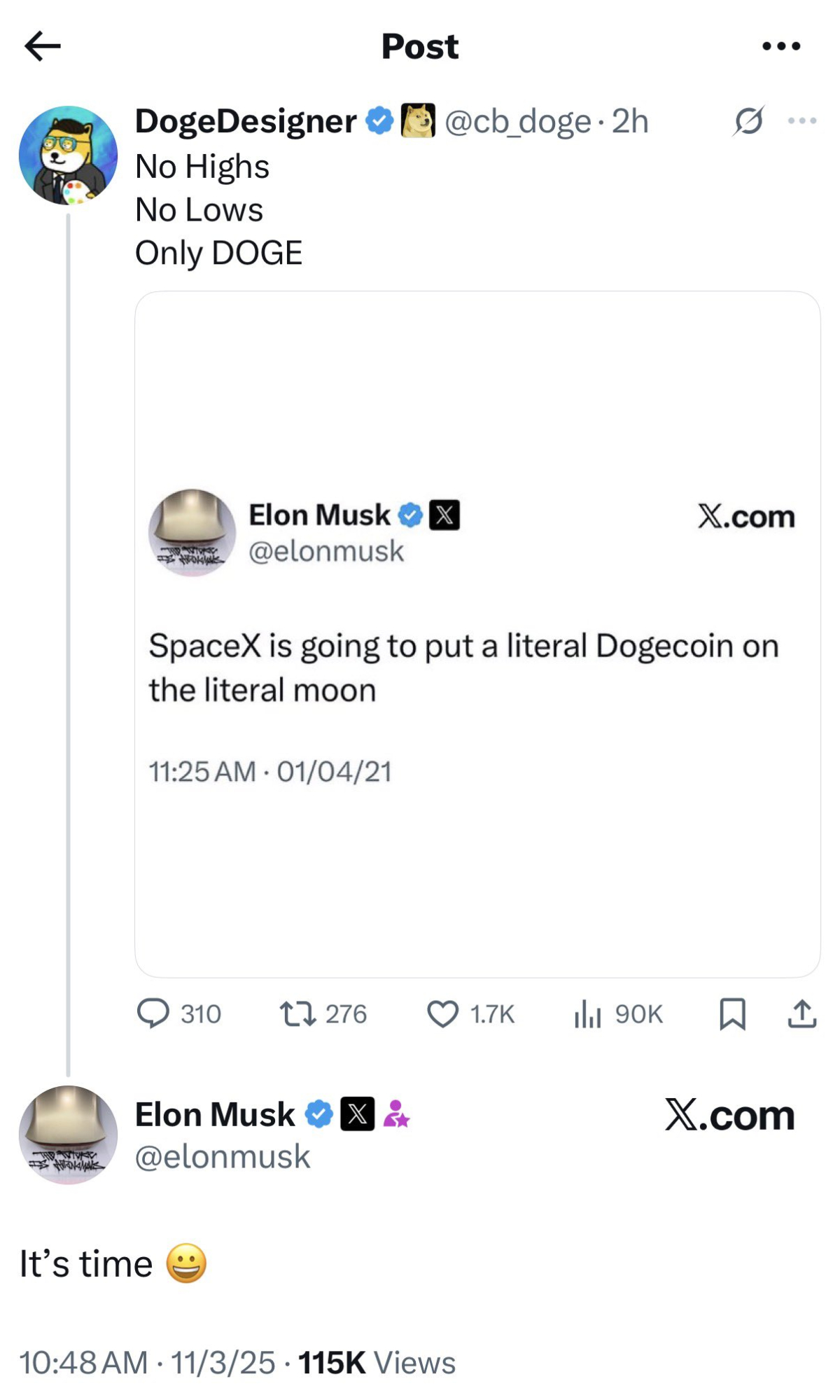 일론 머스크가 2021년 자신이 올린 "도지코인을 달에 보내겠다"는 게시물을 재인용하며 "때가 왔다(It is time)"고 금일 밝혔다.