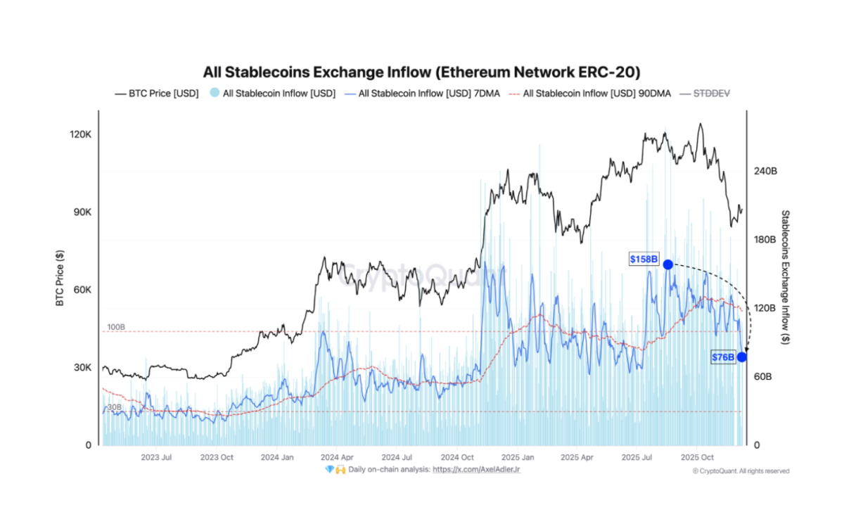 비트코인이 반등에 실패하고 있는 핵심 원인으로 스테이블코인 유입 급감이 지목됐다.암호화폐 온체인 분석 플랫폼 크립토퀀트(CryptoQuant)의 애널리스트 다크포스트(Darkfost)는 금일 "비트코인이 현재 반등하기 어려운 핵심 이유 중 하나는 증가하는 유동성의 부족"이라며 "가상자산 시장에서 우리가 논의하는 유동성은 주로 스테이블코인을 가리킨다"고 밝혔다.