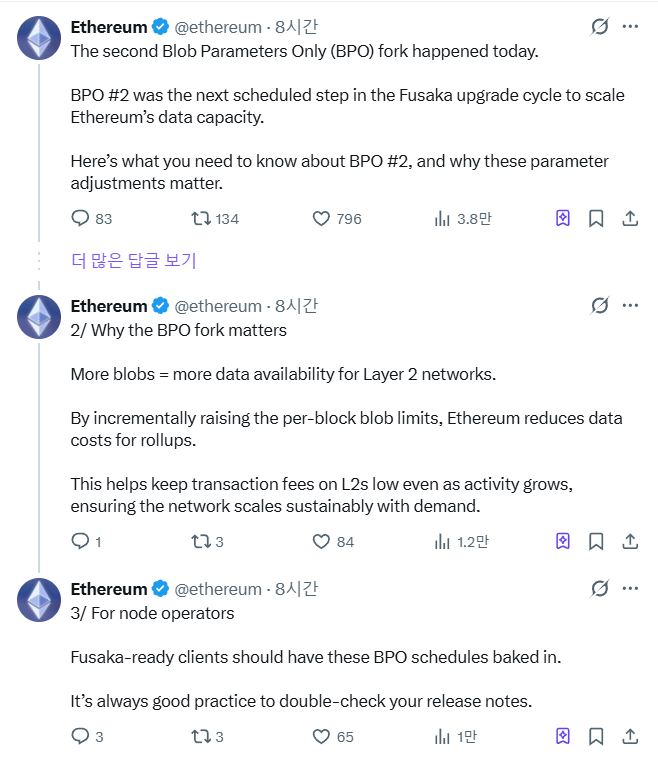 이더리움 공식 X 채널은 "매년 한 번씩 진행되는 대규모 업그레이드를 기다려 네트워크 용량을 조정하는 대신, BPO 포크를 통해 이더리움은 블롭 목표값 같은 특정 매개변수를 독립적이고 효율적으로 미세 조정할 수 있게 됐다"며 "이러한 점진적 확장 방식은 네트워크가 단계별로 더 높은 부하를 안전하게 테스트할 수 있도록 한다"고 설명했다.