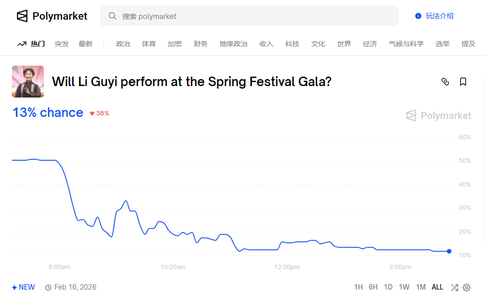 폴리마켓은 다가오는 춘절 연휴 특별 방송인 춘완을 주제로 여러 예측 시장을 동시에 오픈했다. 춘완은 중국중앙방송(CCTV)이 매년 춘절 전날 밤 생방송으로 진행하는 대형 버라이어티 쇼로, 중화권 최대 시청률을 기록하는 국민 프로그램이다.