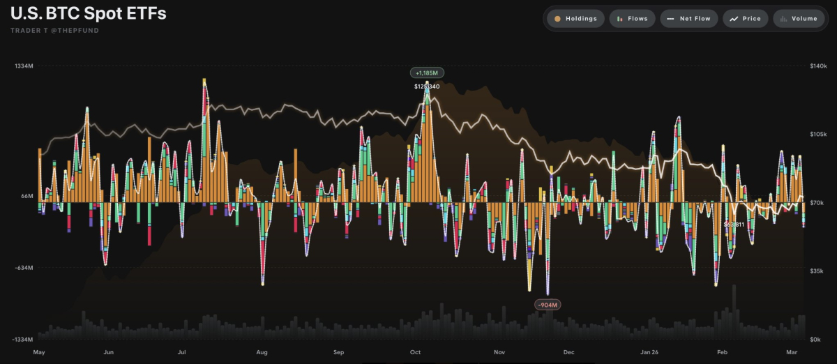 미국 가상자산 현물 상장지수펀드(ETF)에서 전일 총 190억 원의 순유출을 기록했다.트레이더 T(Trader T) 모니터링에 따르면, 5일 미국 현물 비트코인 ETF 전체 순유출액은 2억 4,014만 달러(한화 3,540억 원)를 기록했다. 블랙록(BlackRock)의 IBIT가 1억 105만 달러(한화 1,490억 원)의 순유출로 전체 유출을 주도했다.